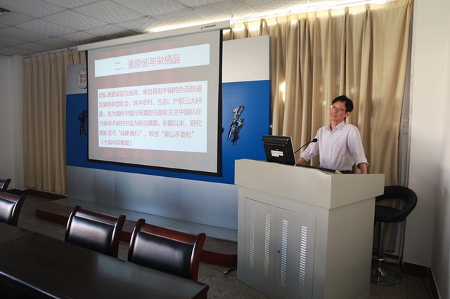 2014年10月9日下午,生态文明与现代中国研究中心主任温锐在马克思主义学院大会议室,面对全院职工作首席教授综合考核汇报。接校有关通知,我校八位首席教授将在校学术委员会上就聘期内(2011―2014年)的综合考核内容进行个人述职。温锐教授聘任为马克思主义中国化学科(以“中国近现代基本问题”为载体)的首席教授,也是我院唯一一位首席教授。 在汇报会上,温锐教授对其三年来的工作,就其成绩特色概括为稳定开放的特色团队、卓越的科研成果、多元化的学术交流三个主要方面,并予以说明。如亮点之一:在研究工作上,秉着“自律•独行”的治学精神,形成了独特与践行的“自律与独行,为学方知乐”团队精神。