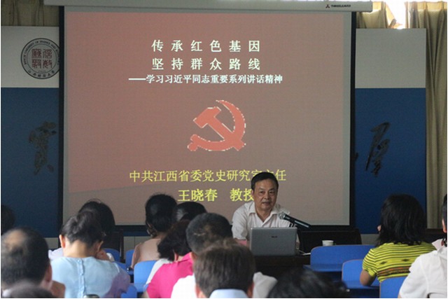 5月29日下午,我院会议室座无虚席,中共江西省委党史研究室主任王晓春教授应邀做客红土地论坛,作《传承红色基因 坚持群众路线――学习习近平同志系列重要讲话精神》专题讲座。讲座由院长陈始发主持,学院全体教师和部分研究生以及学校部分本科生聆听了讲座。 王晓春教授从“群众”概念内涵的历史演变;党的群众路线形成、发展的历史过程及丰富内涵;新时期如何牢固树立群众观点、始终坚持群众路线这三个方面对习近平总书记系列重要讲话精神进行了精彩解读。王晓春教授的讲座深入浅出,旁征博引,既有理论总结,又有形象说明;既有材料剖析,又有事实根据,观念先进,分析精辟,见解独到,具有很高的学术价值和现实意义。 王晓春教授寄语在座的同学,当代大学生是党的事业的接班人,是红色精神的继承者、是红色基因的传承者、是红色文化的发扬者,要牢记中华民族的灿烂文化和艰苦奋斗史、牢记革命先辈的流血牺牲,走好人生成长的每一步。王晓春教授指出,高等院校是传承红色基因的主阵地,高校教师特别是思政课教师,要用党的红色文化和红色精神滋养同学,使党的红色基因代代相传、永不变色,履行好“教书育人”的神圣职责和光荣使命。 (图/文 彭凯) |