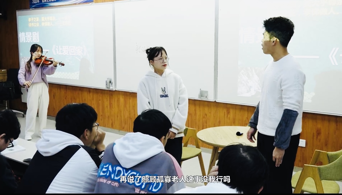 朱清华老师选取了《思想道德与法治》课中关于传承中华传统美德的相关内容,实施了师生同台的授课方式。朱老师通过线下翻转,让学生小组进行展示,学生在讲解中华传统美德基本精神的过程中,通过情景剧表演的形式对中华传统美德的孝道问题进行了精彩展示,让学生在角色扮演和小提琴伴奏等生命体验中真正理解孝的内涵与外延,领悟新时代孝的本真意蕴。
