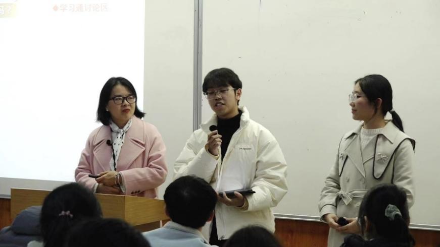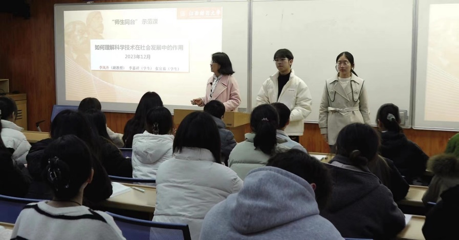 李凤丹老师选取了《马克思主义基本原理》课程教学内容中的“如何理解科学技术在社会发展中的作用”知识点开展了一堂别开生面的“师生同台”示范课。本堂课由李凤丹老师和李嘉祥、张宜茹两位同学同台主讲,众多同学参与交流和讨论,充分展现了“师生同台”教学模式的生动性和趣味性。