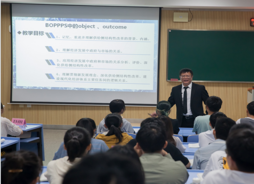 马克思主义学院田凯华与经济学院孙广召两位老师携手呈现了一堂精彩的“双师同堂”示范课。他们充分发挥各自的专业背景优势及知识储备优势,以“推动高质量发展”为主题,为学生分享了一堂悬念迭出、干货满满的“双师同堂”示范课。