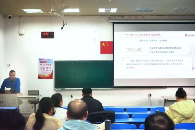 “概论”课教研室杨小东老师聚焦“马克思主义中国化时代化新的飞跃”主题,阐述习近平新时代中国特色社会主义思想的创立背景、科学体系与历史地位,分析其核心要义与理论贡献,明确其是当代中国马克思主义、二十一世纪马克思主义的深刻内涵,探讨其作为强国复兴行动指南的实践要求。