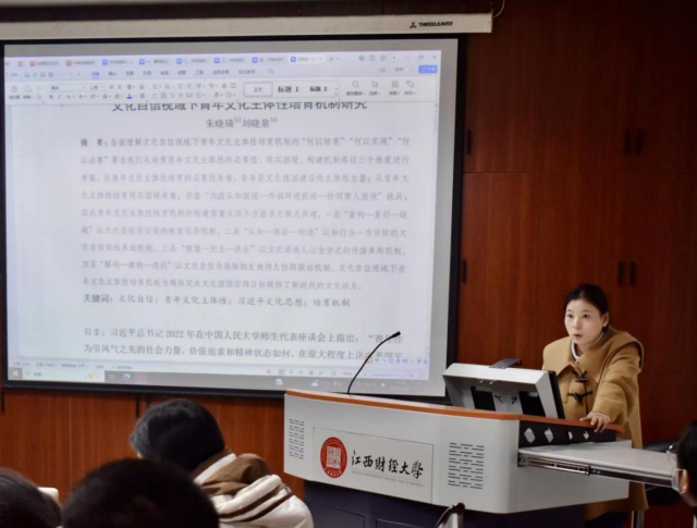 朱晓琦同学聚焦青年成长与文化传承,以《文化自信视域下青年文化主体性培育机制研究》的论文为主题分享研究心得。她认为青年是文化强国建设的主体力量,并阐释了培育青年文化主体性的时代必要性。她还深刻剖析了当前青年群体存在的内在认知碎片化、外部多元思潮与算法文化冲击、育人环节大历史观培育缺位的现实困境,并针对性地提出要构建教育引导、实践养成、传播熏陶、协同保障四大培育机制。
